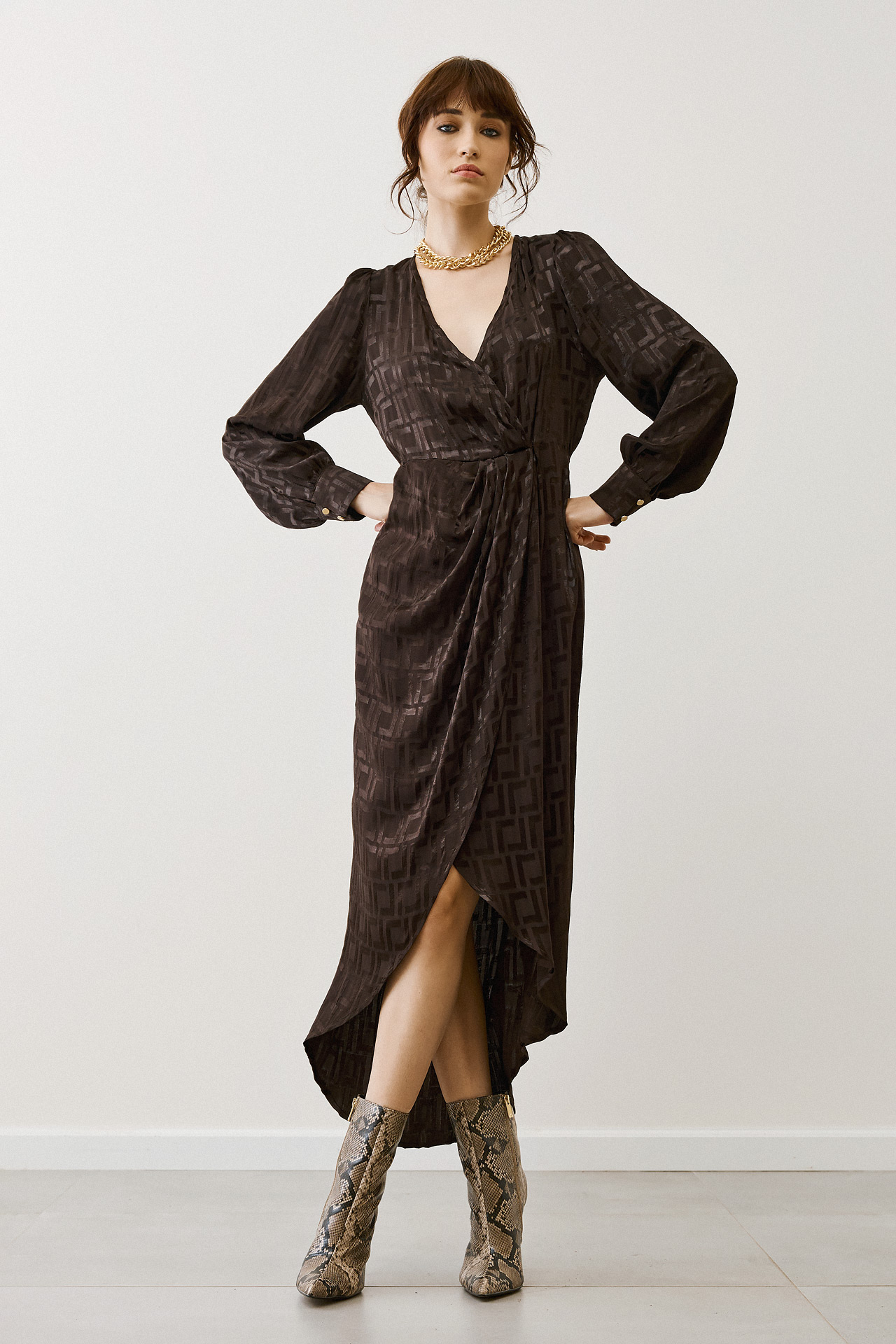 The MORGAN Silky Dress by family-run Greek brand Figaro is cut from a silky deep brown fabric enriched with a subtle geometric pattern that adds depth and elegance. Designed with a wrap-style front, draped detailing at the waist and a side slit, it creates a flattering silhouette that moves with ease and elegance.
