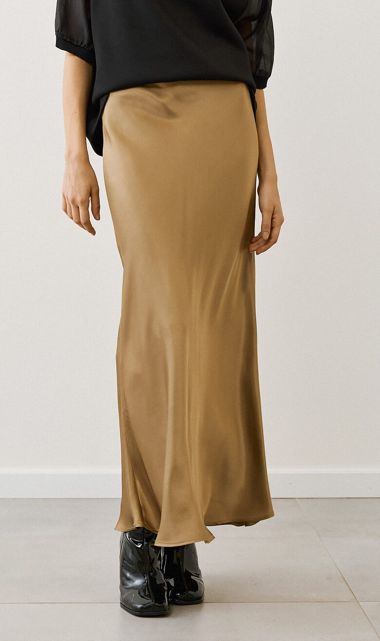 The POPPY Gold Silky Skirt by family-run Greek brand Figaro is made from a smooth, lustrous fabric. Cut in a bias shape with a slightly flared hem, this midi-length skirt (depending on one’s height) skims the body and creates an elegant silhouette. The silky fabric glides over the body and falls into a soft drape that moves gracefully with every step.